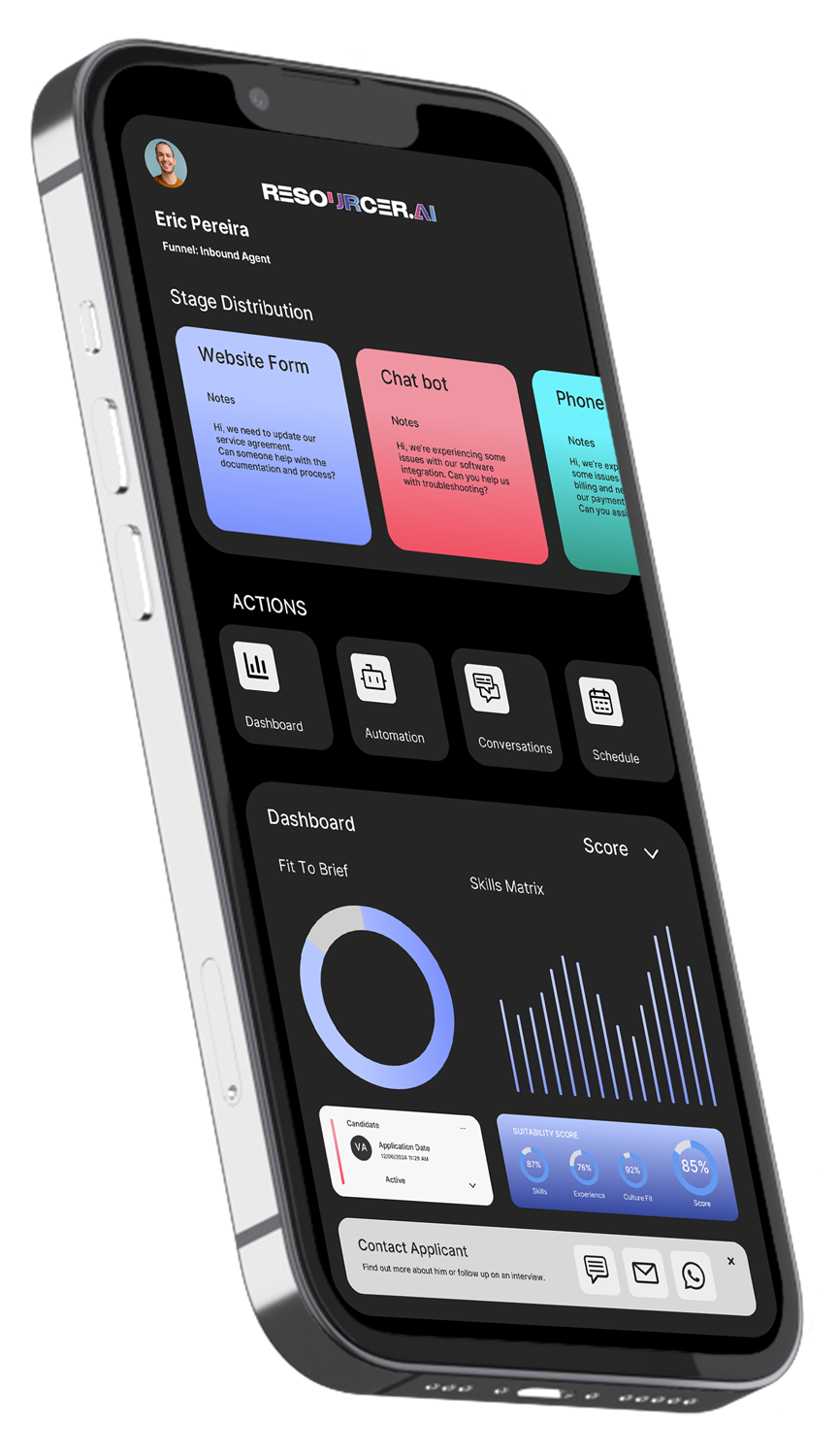 Whether you're filling five roles or fifty, Resourcer keeps the process fast, personal, and on track. Using your data, your systems, and your voice.